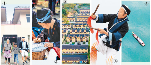 圖①:在“千家瑤寨·萬戶瑤鄉(xiāng)”八圩瑤寨易地扶貧搬遷安置點,村民黎治明(右)一家走出家門。