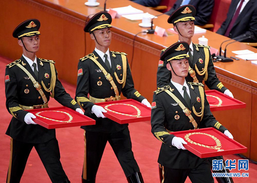 9月8日上午,全國抗擊新冠肺炎疫情表彰大會上,4名禮兵手捧共和國勛章、國家榮譽稱號獎?wù)拢羞M到儀式現(xiàn)場。新華社記者 岳月偉 攝