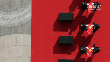 把鮮艷的五星紅旗覆蓋在紫紅色的棺槨上