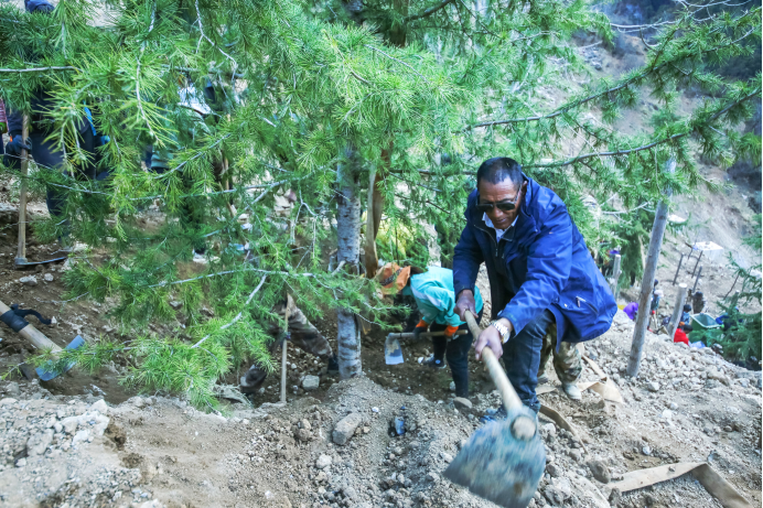 新冠肺炎疫情期間,巴拉格宗景區(qū)關(guān)閉,斯那定珠投入2000多萬購置了4萬多棵樹苗,帶領(lǐng)200多個員工在景區(qū)植樹。 索朗農(nóng)布/攝