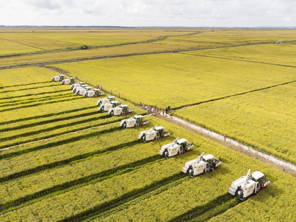 9月22日在黑龍江省富錦市萬畝水稻公園內(nèi)拍攝的開鐮儀式現(xiàn)場(無人機照片)。新華社發(fā)(張濤攝)
