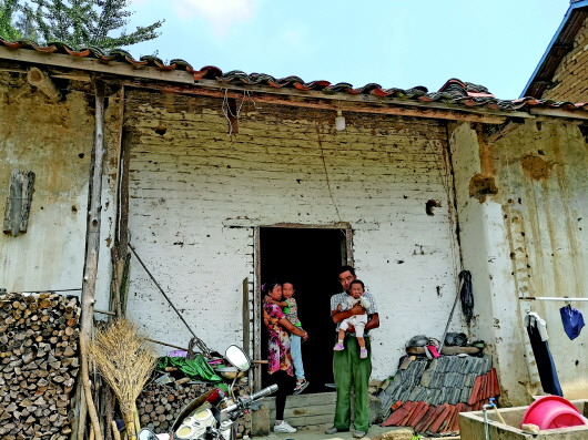 蘇平村珓子石組茶農(nóng)余本高一家四口站在老房子門(mén)前(8月29日攝)。