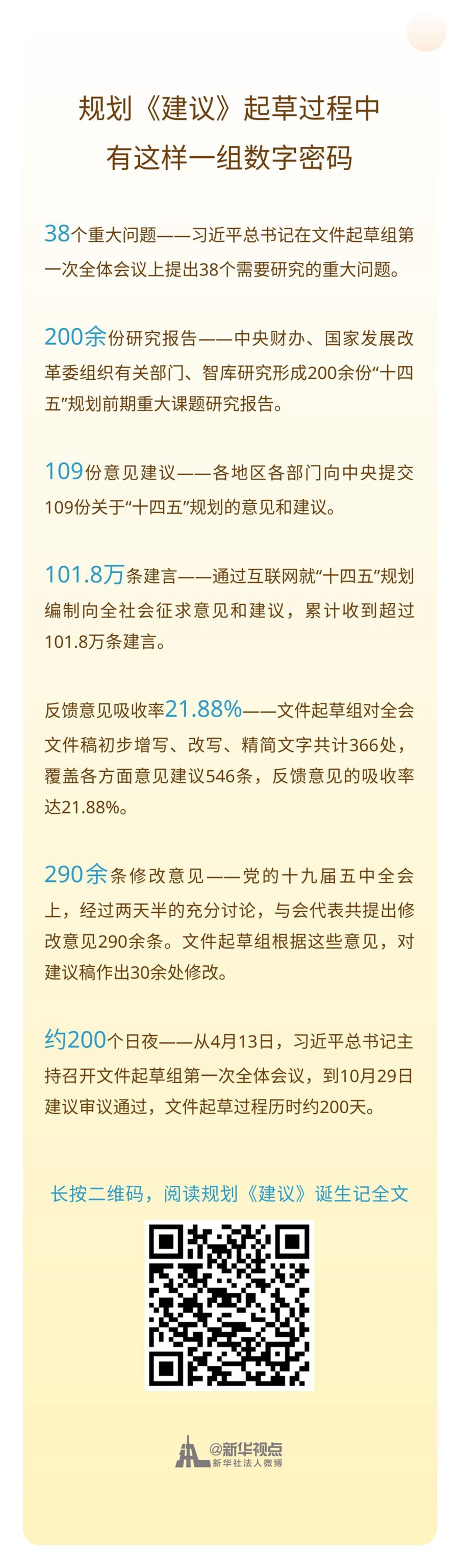 新華社4日播發(fā)了規(guī)劃《建議》誕生記,這篇萬(wàn)字長(zhǎng)文中,披露了規(guī)劃《建議》起草過(guò)程中的一組數(shù)字密碼。