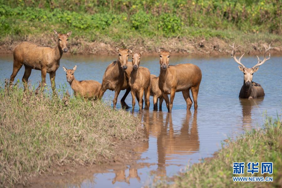 在位于湖南岳陽市的東洞庭湖麋鹿和鳥類救治避難中心拍攝的麋鹿(8月7日攝)。新華社記者 陳思汗 攝