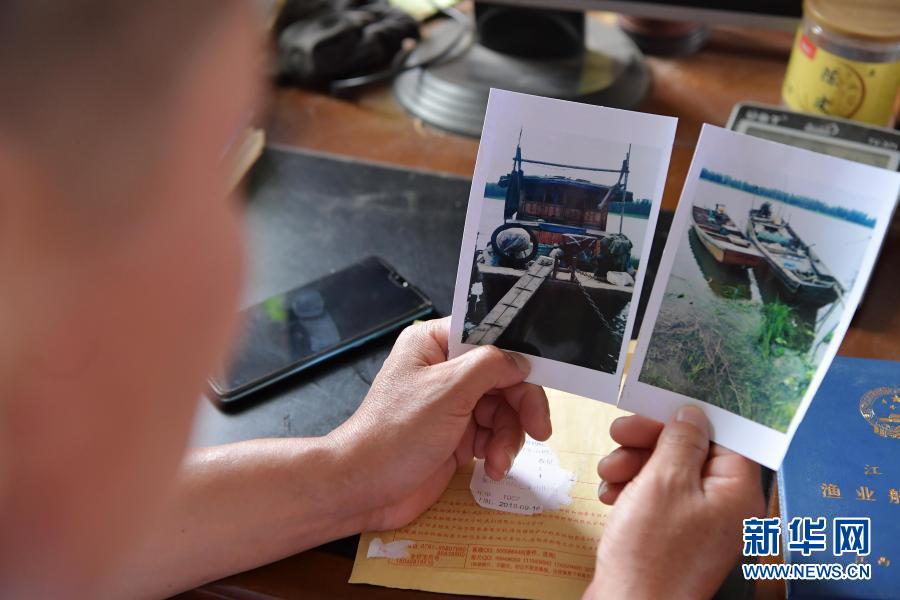 在江西省南昌市新建區(qū)象山鎮(zhèn),上岸漁民吳華山在展示自己珍藏的兩張漁船的照片。這兩條船是吳華山還在當漁民時使用的捕撈船只,上岸轉業(yè)之后,船只上交,他用領到的補貼開始承包魚塘養(yǎng)殖小龍蝦(6月5日攝)。新華社記者 彭昭之 攝