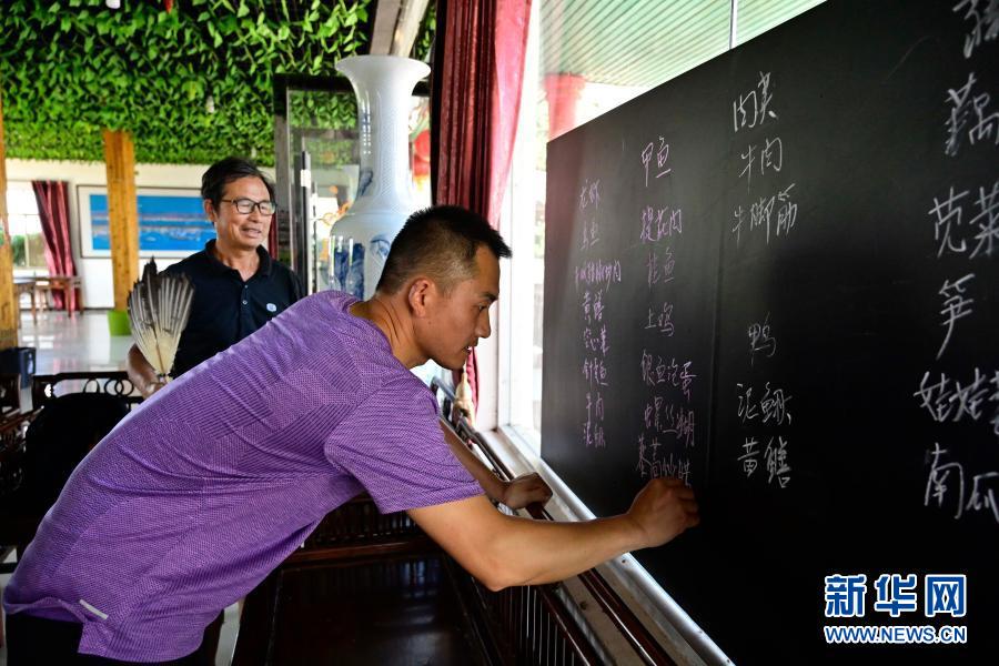 在江西省余干縣田園鄱陽湖景區(qū),上岸漁民朱義才(后)在自己開辦的農家樂內和兒子一起寫當日的菜譜(6月16日攝)。新華社記者 彭昭之 攝