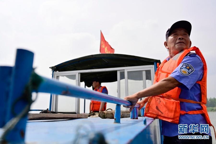 在江西省湖口縣,江豚協(xié)助巡護隊的隊員伍后春在觀察水面是否有違法捕撈的工具。他和他的父親、爺爺三代在鄱陽湖和長江捕魚為生,2017年開始上岸,目前已成為巡護隊隊員(6月8日攝)。新華社記者 彭昭之 攝
