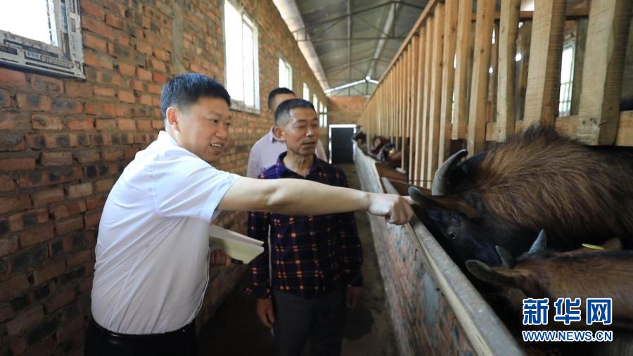 全國勞動(dòng)模范、四川省南江五郎黃羊養(yǎng)殖專業(yè)合作社理事長汪其德(左一)在巴中市南江縣紅旗村村民家中指導(dǎo)養(yǎng)羊技術(shù)(資料照片)。新華社發(fā)