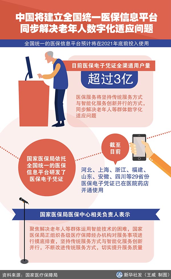 新華社北京11月26日電(記者屈婷)記者從國家醫(yī)療保障局了解到,全國統(tǒng)一的醫(yī)保信息平臺預(yù)計將在2021年底前投入使用,目前醫(yī)保電子憑證全渠道用戶量超過3億。同時,醫(yī)保服務(wù)將堅持傳統(tǒng)服務(wù)方式與智能化服務(wù)創(chuàng)新并行的方式,同步解決老年人等群體數(shù)字化適應(yīng)問題。