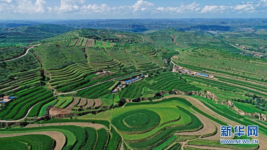這是2018年7月16日拍攝的寧夏彭陽(yáng)縣金雞坪梯田公園(無(wú)人機(jī)照片)。新華社記者 王鵬 攝