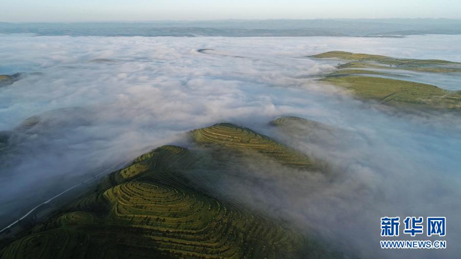 這是2018年7月17日拍攝的云霧繚繞的寧夏彭陽(yáng)縣金雞坪梯田公園(無(wú)人機(jī)照片)。新華社記者 王鵬 攝