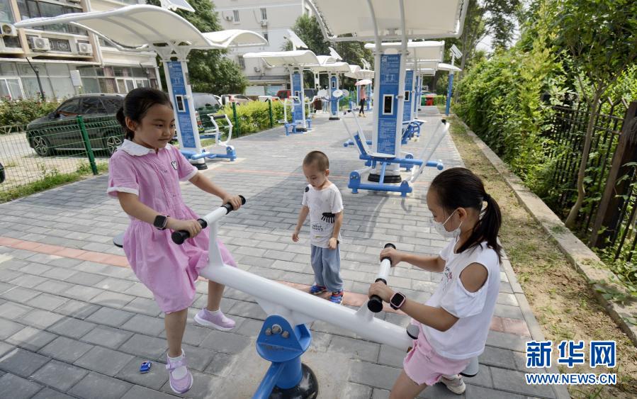 孩子們?cè)诨佚堄^龍澤苑社區(qū)內(nèi)的健身廣場(chǎng)玩耍(8月11日攝)。新華社記者 李欣 攝