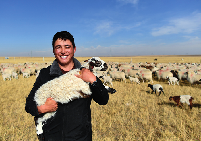 青海省剛察縣泉吉鄉(xiāng)寧夏村牧民達日杰懷抱一只小羊羔(11月12日攝) 張宏祥攝/本刊