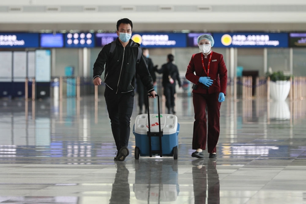 ▲ 2020年4月24日,武漢協(xié)和醫(yī)院心外科醫(yī)生盧雄豪(左)運送來自山東的供肺抵達(dá)武漢天河機(jī)場。疫情期間原定航班取消,移植團(tuán)隊與中國國際航空公司聯(lián)系后,該公司緊急啟動綠色通道,重新開通此航班。新華社記者 沈伯韓攝