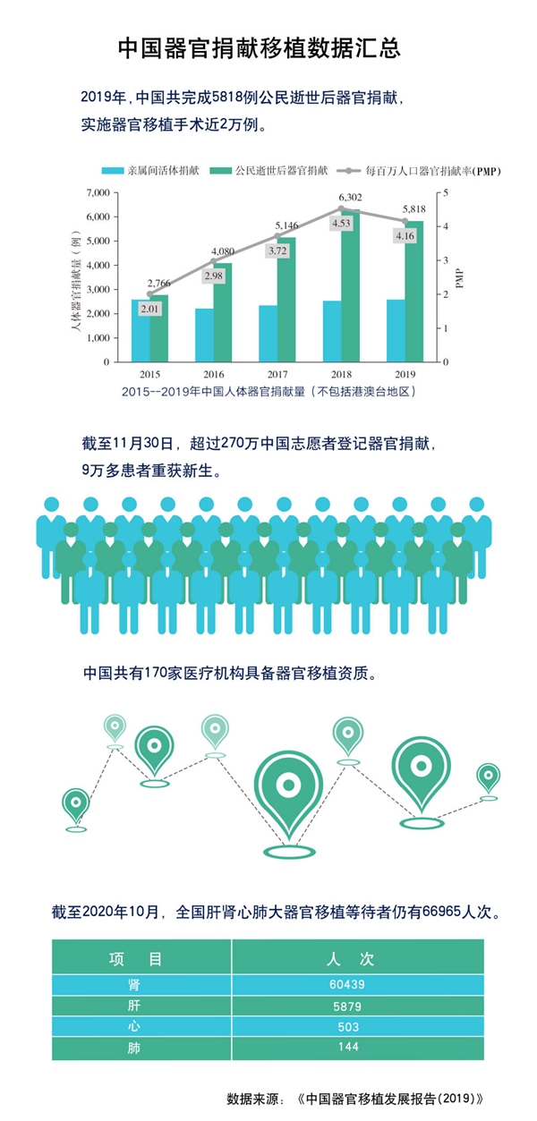 ——進(jìn)一步拓寬器官捐獻(xiàn)來源滿足移植需求。“中國器官捐獻(xiàn)數(shù)量和捐獻(xiàn)率雖逐年增長,但與國內(nèi)患者的巨大需求相比相距甚遠(yuǎn)。”王海波說,截至2020年10月,全國仍有60439人次等待腎移植、5879人次等待肝移植、503人次等待心移植、144人次等待肺移植。