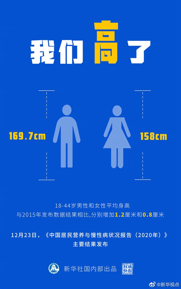 你的營(yíng)養(yǎng)和健康情況怎樣?高了?身體倍棒?12月23日,一份關(guān)乎你我的健康大數(shù)據(jù)重磅上新,《中國(guó)居民營(yíng)養(yǎng)與慢性病狀況報(bào)告(2020年)》主要結(jié)果發(fā)布——成人平均身高繼續(xù)增長(zhǎng),營(yíng)養(yǎng)不足問題得到改善,健康意識(shí)逐步增強(qiáng)。(記者:陳聰,海報(bào)設(shè)計(jì):張晨光) ????