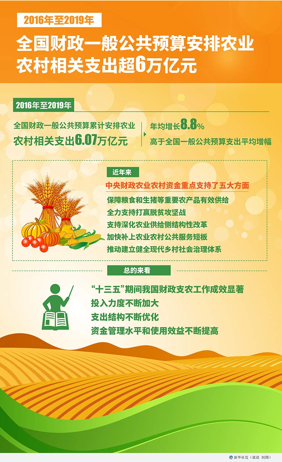 新華社北京12月23日電(記者申鋮)財政部部長劉昆23日表示,2016年至2019年,全國財政一般公共預(yù)算累計安排農(nóng)業(yè)農(nóng)村相關(guān)支出6.07萬億元,年均增長8.8%,高于全國一般公共預(yù)算支出平均增幅。