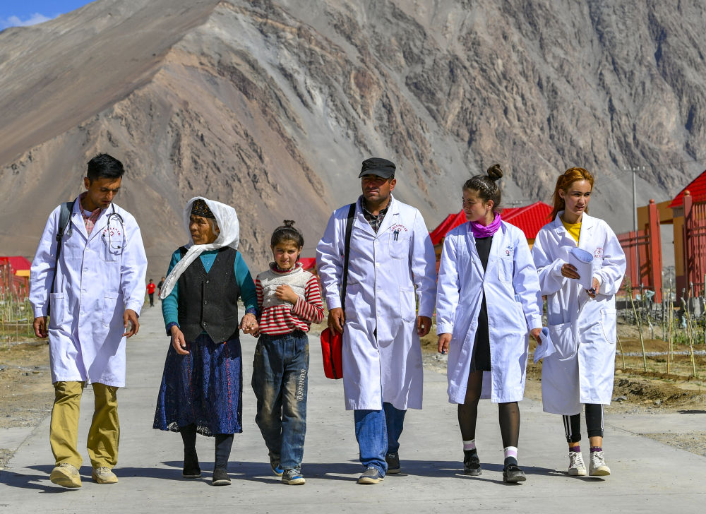 新疆塔什庫爾干塔吉克自治縣達布達爾鄉(xiāng)熱斯喀木村村醫(yī)發(fā)爾亞特·塔西白克(右三)與醫(yī)務人員來到當?shù)匾椎胤鲐毎徇w安置點出診(2019年7月7日攝)。新華社記者 胡虎虎 攝