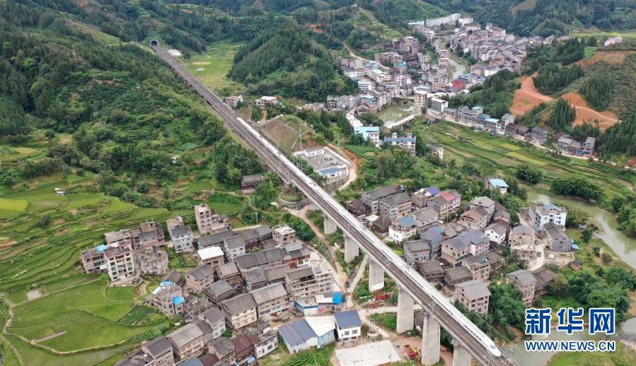 2020年10月4日,一列動車行經(jīng)貴廣高鐵三江侗族自治縣同樂苗族鄉(xiāng)同樂村路段(無人機照片)。