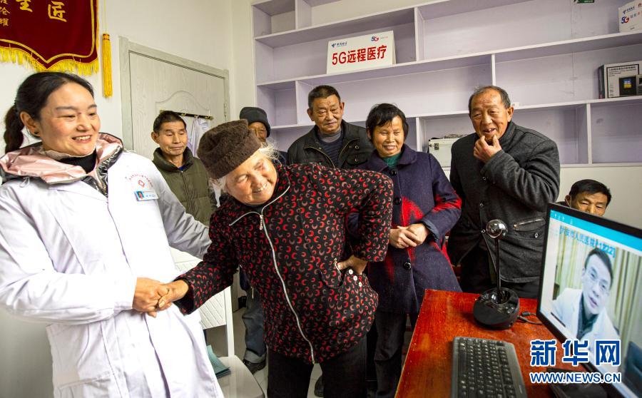 2020年12月3日,安徽省金寨縣大灣村村民方臨芳(左二)指著自己身體疼痛的部位,在村醫(yī)袁玲(左一)的幫助下向5G遠程醫(yī)療會診的專家講述病情。