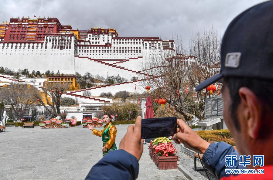 2020年3月1日,西藏布達(dá)拉宮管理處的講解員次仁卓嘎(左)在進行直播。