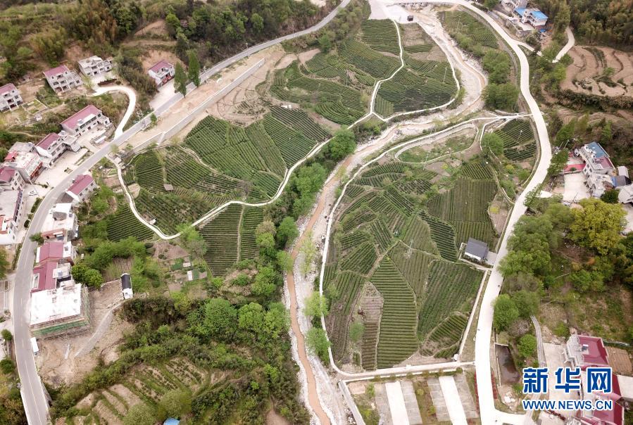 這是2020年4月17日拍攝的金寨縣花石鄉(xiāng)大灣村的茶產(chǎn)業(yè)扶貧基地(無人機(jī)照片)。新華社記者劉軍喜攝