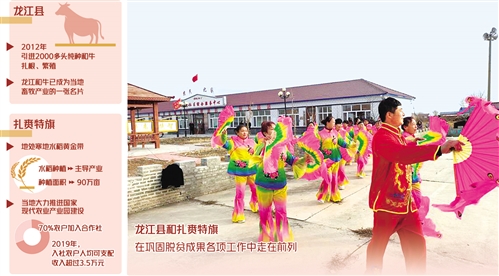 龍江縣是著名的雜糧產(chǎn)區(qū)、畜牧大縣。如今,龍江和牛已成為龍江縣畜牧產(chǎn)業(yè)的一張名片,帶領(lǐng)群眾走上致富路?!拔覀冄芯恐贫恕陡邫n肉牛優(yōu)勢(shì)特色產(chǎn)業(yè)集群建設(shè)方案》,從2016年起出臺(tái)了扶持政策?!饼埥h委副書記孫立軍告訴記者,當(dāng)?shù)匾龑?dǎo)企業(yè)與農(nóng)戶合作養(yǎng)牛,農(nóng)戶每購買兩頭母牛,政府會(huì)給予一定的補(bǔ)貼款。此外,政府還向企業(yè)采購凍精幫助農(nóng)戶繁育小牛,小牛犢生長到6個(gè)月達(dá)標(biāo)后,由企業(yè)統(tǒng)一收購,價(jià)格在1.2萬元至1.4萬元不等。
