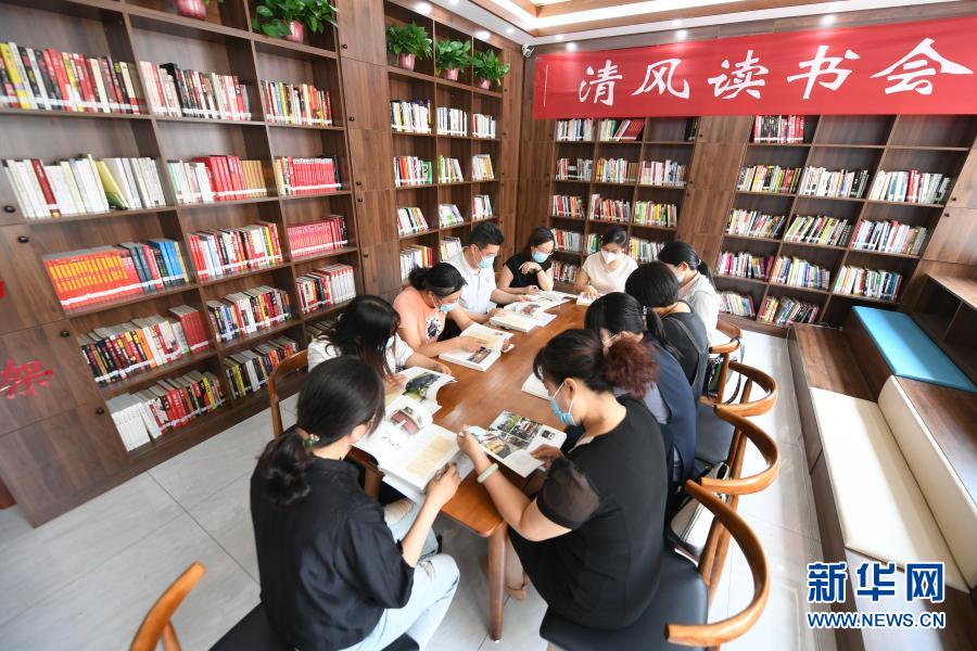 2020年6月23日,河北省棗強(qiáng)縣紀(jì)委監(jiān)委組織部分單位黨員干部,在縣文化廣電和旅游局舉行“清風(fēng)讀書會”。新華社記者 李曉果 攝