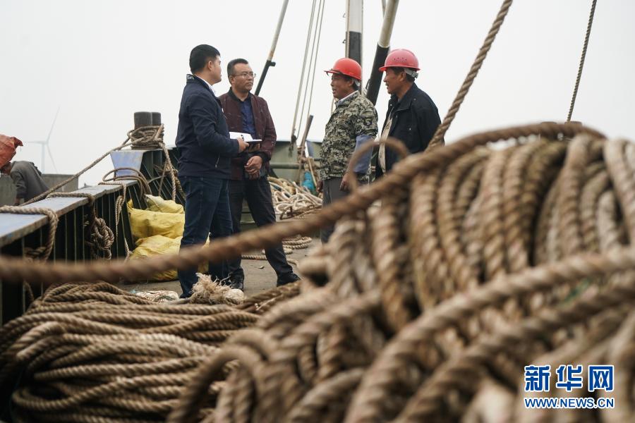 2020年10月21日,江蘇省海安市濱海新區(qū)紀(jì)工委干部(左一、左二)向漁船負(fù)責(zé)人詢問惠漁油補(bǔ)發(fā)放情況。 新華社記者 季春鵬 攝
