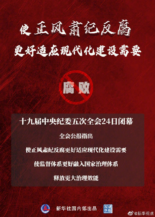 24日,十九屆中央紀委五次全會閉幕。全會公報指出:使正風(fēng)肅紀反腐更好適應(yīng)現(xiàn)代化建設(shè)需要,使監(jiān)督體系更好融入國家治理體系,釋放更大治理效能。(記者:朱基釵、孫少龍;海報設(shè)計:朱舜)?