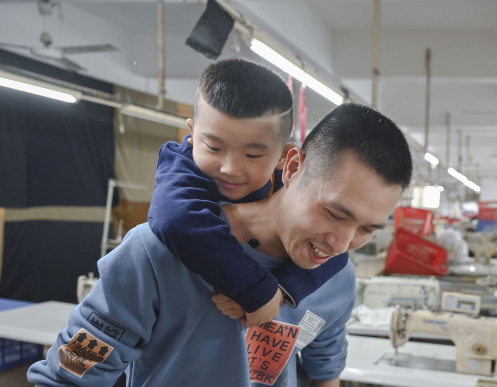 1月26日,在福建省石獅市的金利萊斯服裝廠,聰聰和黃海龍在一起。