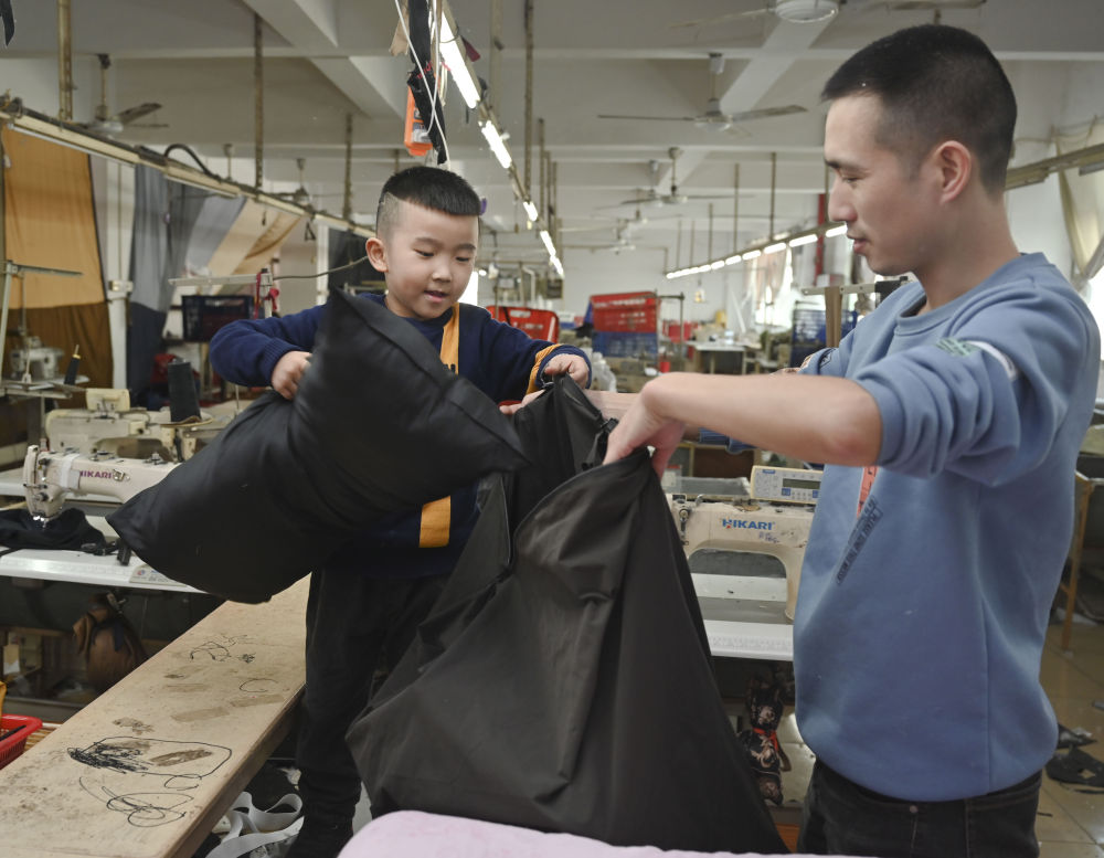 今年春節(jié),黃海龍決定在福建就地過年,這讓5歲的小兒子聰聰高興不已。這是聰聰?shù)谝淮卧诔錾睾桶职謰寢屢黄疬^年。盡管如此,黃海龍還是割舍不下遠在四川老家的親人,特地為他們做了羽絨服、袖套、枕頭、圍裙等寄回去。
