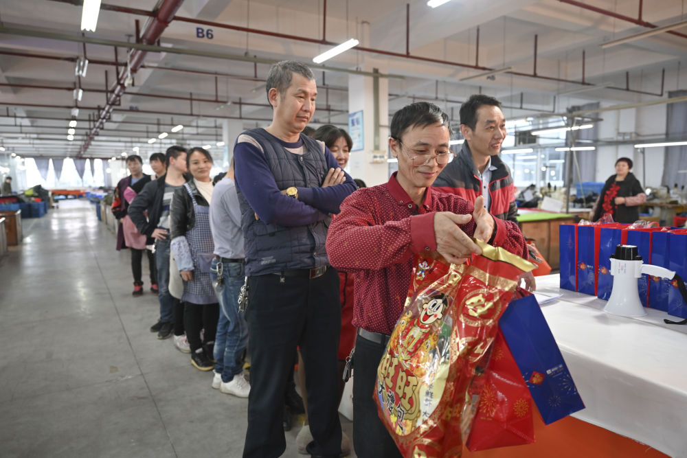 在工廠工作了十多年的張良國將領(lǐng)到的年貨拍成照片,發(fā)給遠在四川老家的兒子,告訴家人這里一切都好。