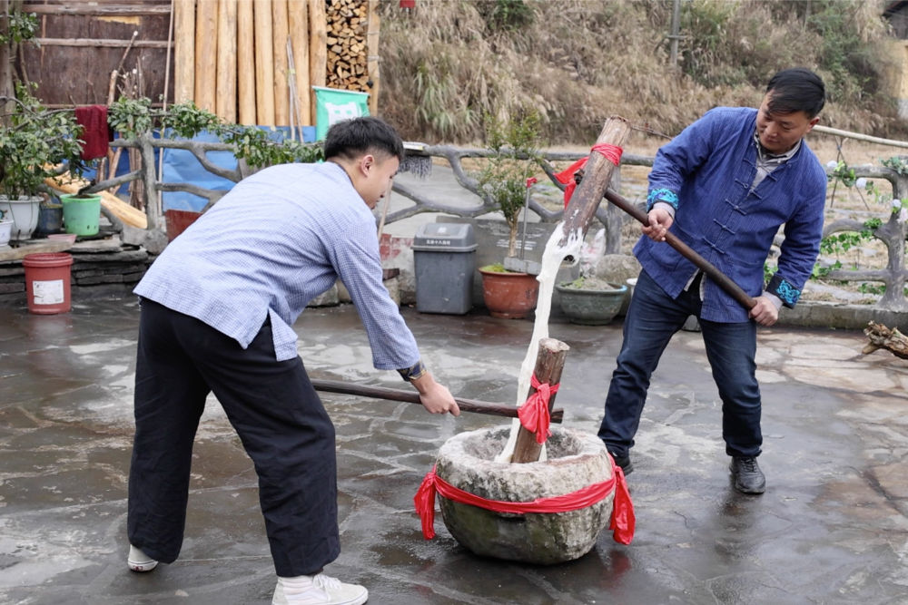 2月3日,在湖南省湘西土家族苗族自治州花垣縣十八洞村,村民在打糍粑,儲(chǔ)備過(guò)年物資。新華社記者 陳思汗 攝