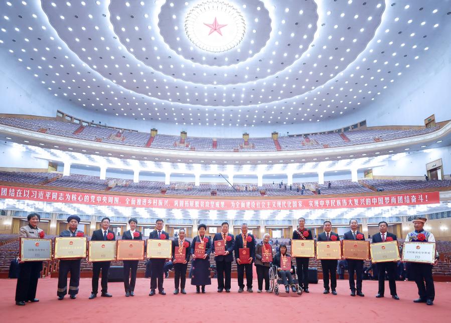照片上,人民大會(huì)堂大禮堂標(biāo)志性的璀璨天頂,燦若星河。剛剛受到表彰的全國脫貧攻堅(jiān)楷模榮譽(yù)稱號獲得者,胸戴獎(jiǎng)?wù)?、大紅花,手捧證書、獎(jiǎng)牌,聚攏在一起。
