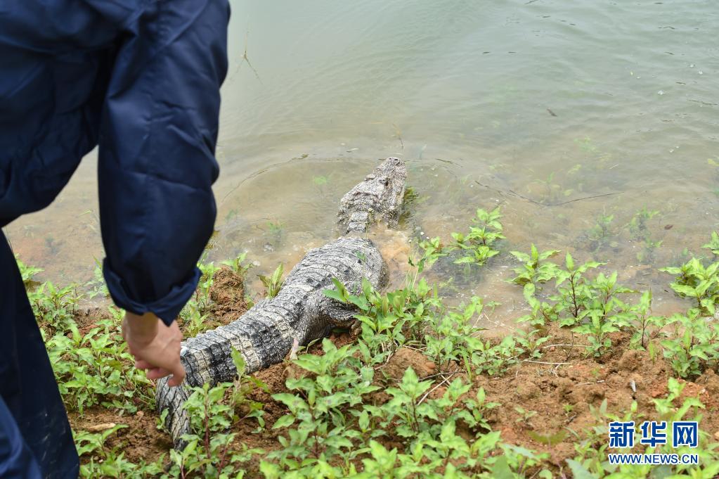 5月13日,工作人員放歸揚(yáng)子鱷。當(dāng)日,安徽揚(yáng)子鱷國(guó)家級(jí)自然保護(hù)區(qū)在涇縣雙坑片區(qū)揚(yáng)子鱷核心棲息地放歸51條人工繁育揚(yáng)子鱷?!⌒氯A社記者 韓旭 攝