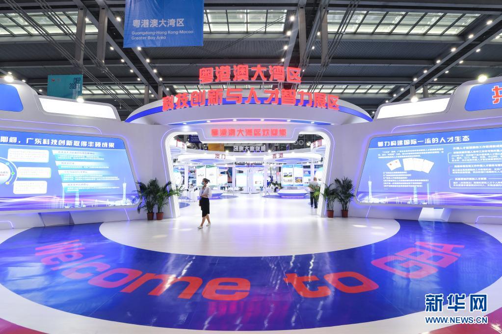 與會(huì)者走過(guò)中國(guó)國(guó)際人才交流大會(huì)設(shè)立的粵港澳大灣區(qū)科技創(chuàng)新與人才智力展區(qū)(2021年4月24日攝)。新華社記者 毛思倩 攝