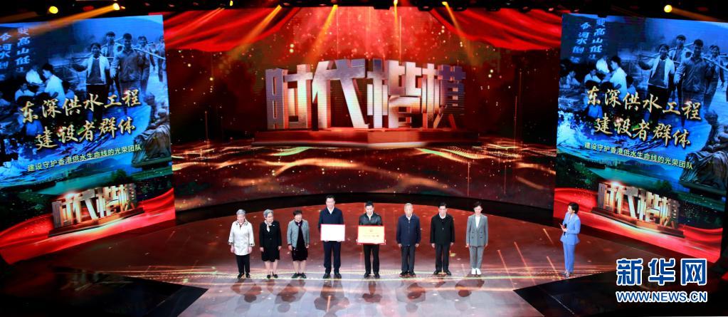 東深供水工程建設(shè)者群體代表在“時(shí)代楷?!卑l(fā)布儀式上領(lǐng)取“時(shí)代楷?!豹?jiǎng)牌和證書(2021年4月18日攝)。新華社記者 潘旭 攝