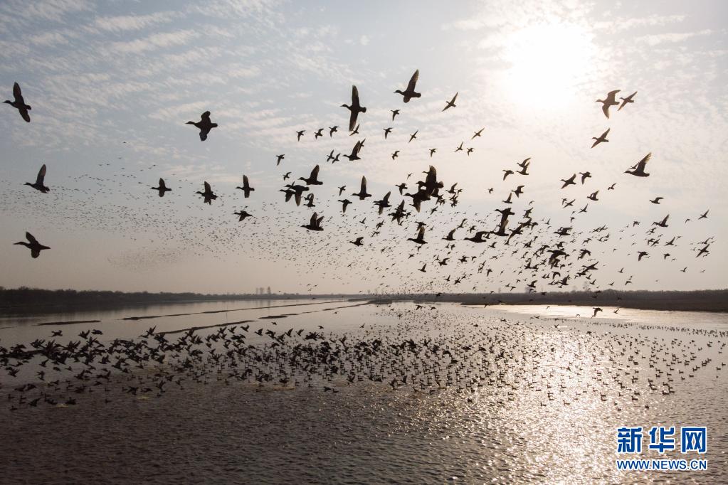成群羅紋鴨在湖南西洞庭湖國(guó)家級(jí)自然保護(hù)區(qū)飛翔(2020年11月11日攝,無(wú)人機(jī)照片)。新華社記者 陳思汗 攝