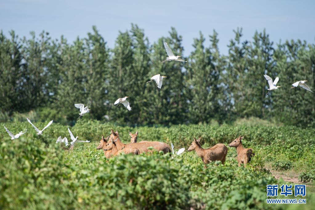 這是2020年8月7日在湖南岳陽(yáng)東洞庭湖麋鹿和鳥(niǎo)類(lèi)救治避難中心拍攝的麋鹿和飛鳥(niǎo)。新華社記者 陳思汗 攝