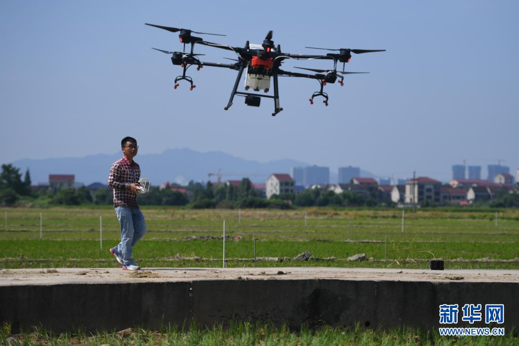 工作人員在湖南省益陽(yáng)市赫山區(qū)米香村的稻田旁操控?zé)o人機(jī)給晚稻打藥(2020年7月23日攝)。新華社記者 薛宇舸 攝