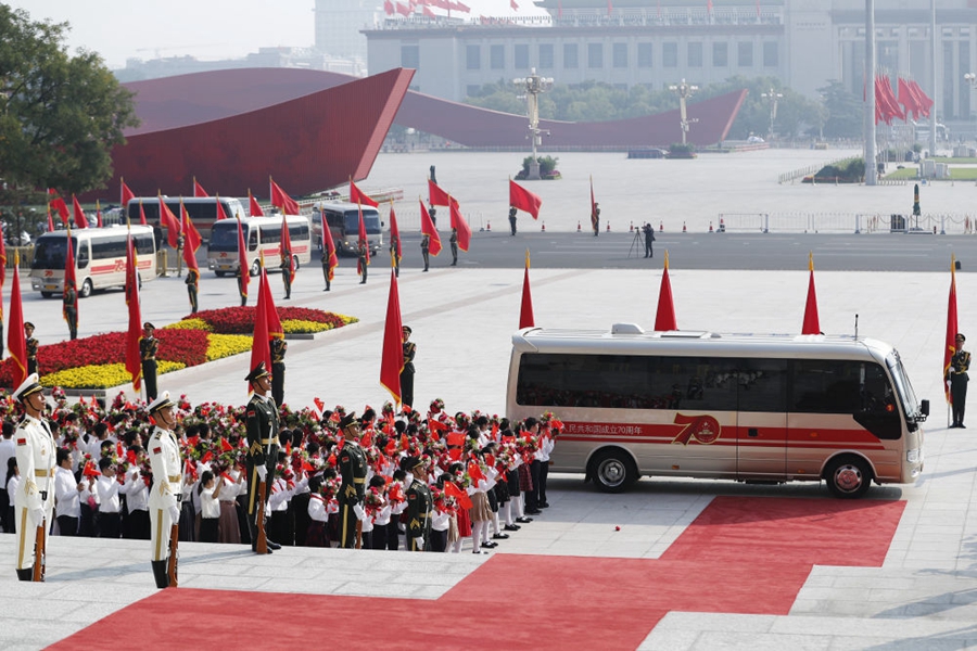 人民大會堂東門外,高擎紅旗的禮兵分列道路兩側(cè),肩槍禮兵在臺階上莊嚴(yán)佇立。車隊(duì)抵達(dá)時(shí),早已迎候在這里的青少年們迸發(fā)出熱情的歡呼。