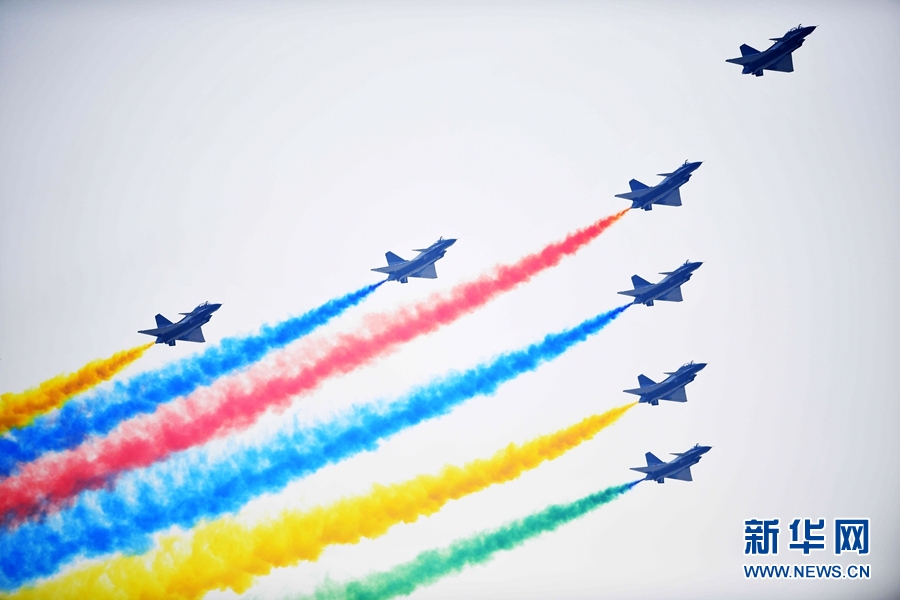 新華社北京10月1日電(張汨汨、周正新)1架空警-2000預(yù)警機(jī)和8架殲-10飛機(jī)組成領(lǐng)隊(duì)機(jī)梯隊(duì),10月1日飛臨天安門廣場(chǎng)上空接受檢閱。殲-10飛機(jī)拉出七道絢麗的彩煙,慶祝新中國(guó)成立70周年。