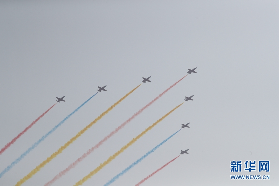 10月1日上午,慶祝中華人民共和國(guó)成立70周年大會(huì)在北京天安門廣場(chǎng)隆重舉行。這是受閱的空中梯隊(duì)。 新華社記者 王曄 攝