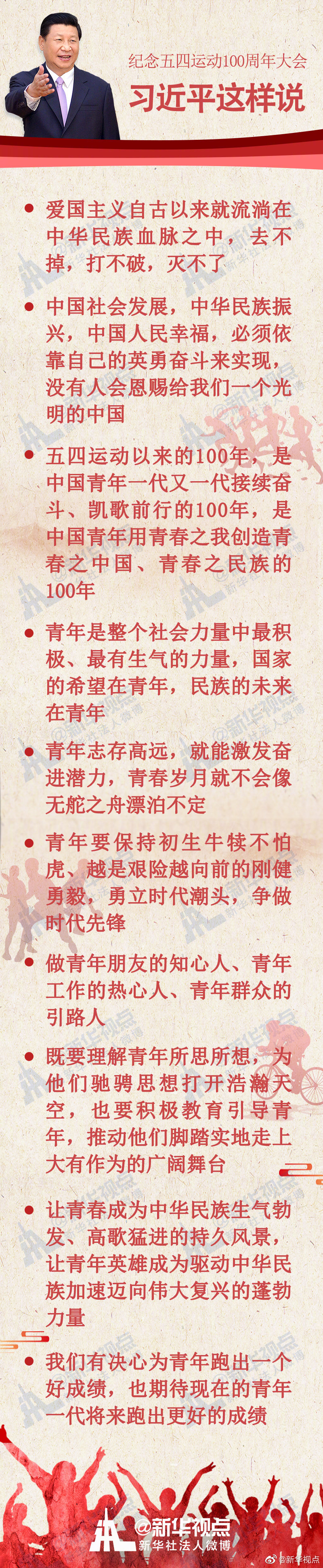 紀(jì)念五四運動100周年大會今天上午在北京人民大會堂隆重舉行,中共中央總書記、國家主席、中央軍委主席習(xí)近平出席大會并發(fā)表重要講話。戳圖看金句↓ ????