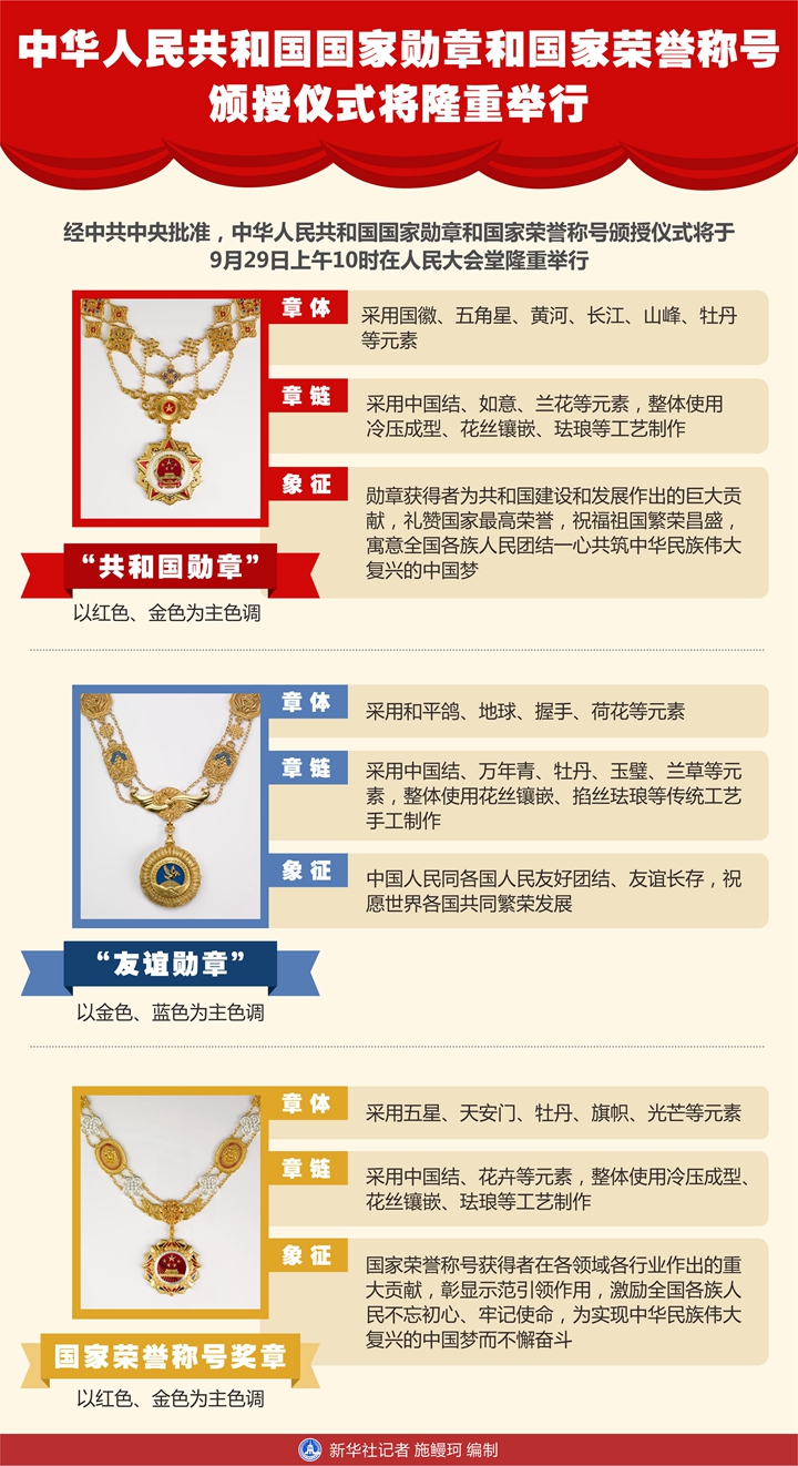 經(jīng)中共中央批準(zhǔn),中華人民共和國(guó)國(guó)家勛章和國(guó)家榮譽(yù)稱號(hào)頒授儀式將于9月29日上午10時(shí)在北京人民大會(huì)堂隆重舉行。 這是國(guó)家榮譽(yù)稱號(hào)獎(jiǎng)?wù)隆?新華社發(fā)