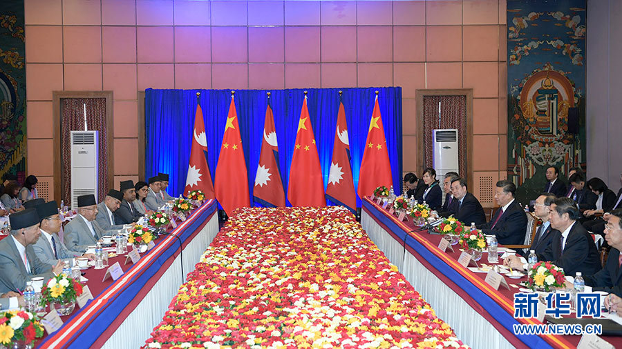 10月13日,國家主席習(xí)近平在加德滿都同尼泊爾總理奧利會談。 新華社記者 李學(xué)仁 攝