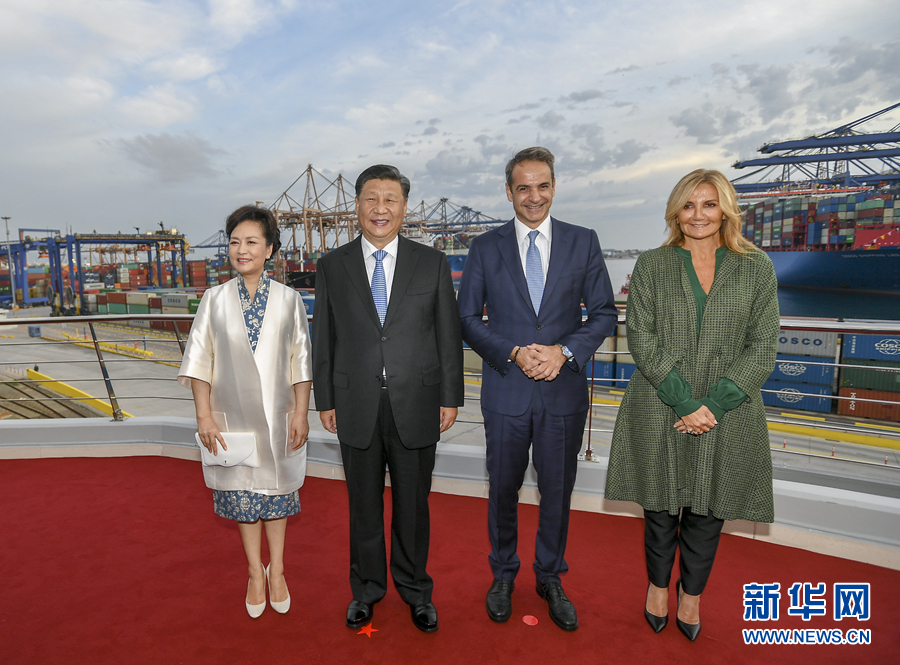 當(dāng)?shù)貢r間11月11日,國家主席習(xí)近平和夫人彭麗媛在希臘總理米佐塔基斯夫婦陪同下,共同參觀中遠海運比雷埃夫斯港項目。這是習(xí)近平和夫人彭麗媛同米佐塔基斯夫婦在港口樓頂平臺合影。 新華社記者 謝環(huán)馳 攝