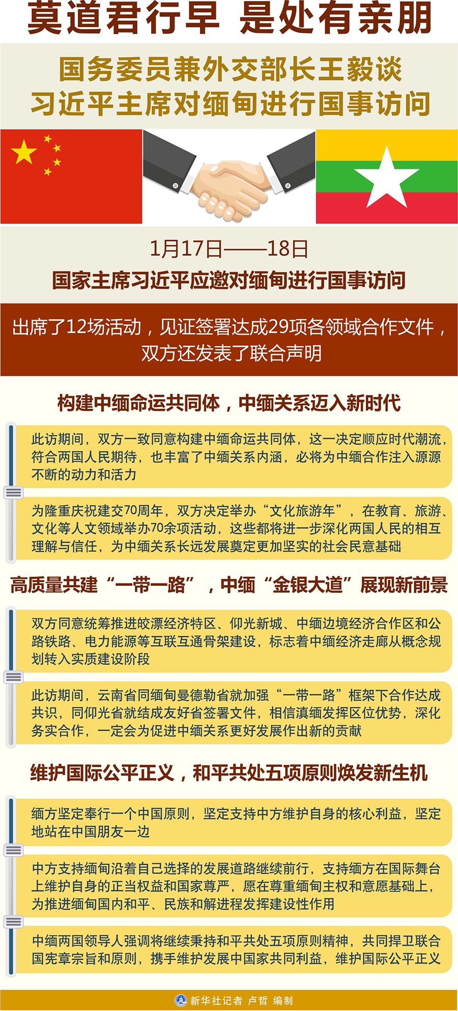 新華社內(nèi)比都1月18日電? 1月17日至18日,國(guó)家主席習(xí)近平應(yīng)邀對(duì)緬甸進(jìn)行國(guó)事訪問(wèn)。行程結(jié)束之際,國(guó)務(wù)委員兼外交部長(zhǎng)王毅向隨行記者介紹此訪情況。
