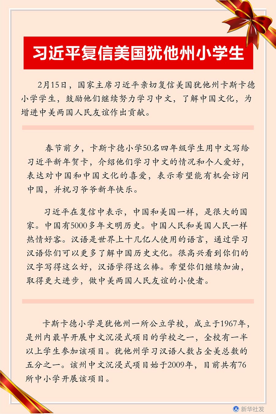 新華社北京2月22日電? 2月15日,國家主席習(xí)近平親切復(fù)信美國猶他州卡斯卡德小學(xué)學(xué)生,鼓勵他們繼續(xù)努力學(xué)習(xí)中文,了解中國文化,為增進(jìn)中美兩國人民友誼作出貢獻(xiàn)。